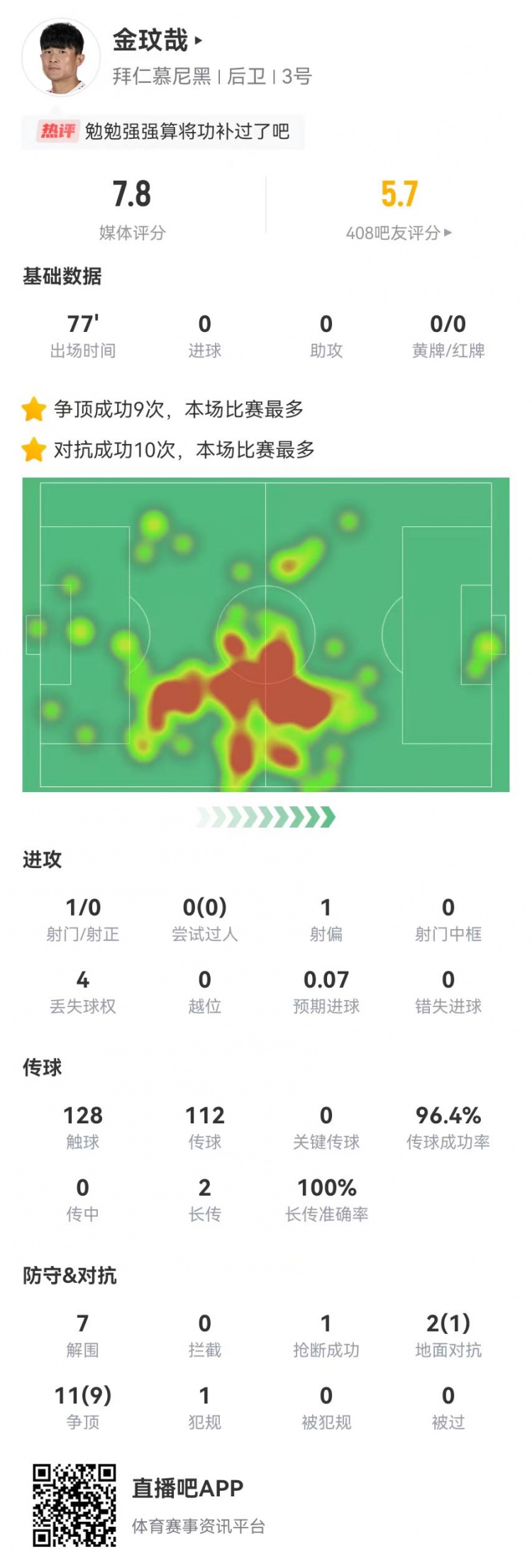 11月30日讯 拜仁在本轮德甲3-1逆转圣保利,惨遭生吃导致丢球的金玟哉本场数据如下: