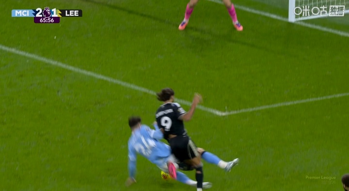 11月30日讯 曼城vs利兹联第66分钟,格瓦迪奥尔飞铲直接放倒了勒温,裁判判罚点球,外加黄牌一张!恩梅查点射没进,但是补射进了。此时比分变为曼城2-2利兹联。