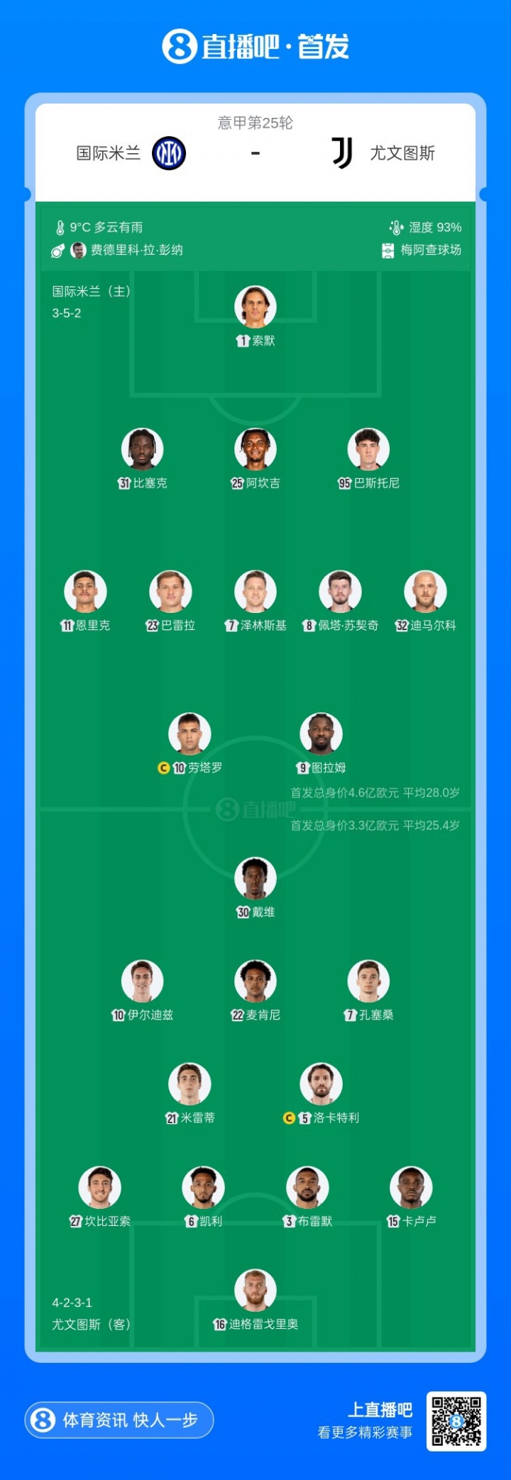 国米首发:1-索默、31-比塞克、25-阿坎吉、95-巴斯托尼、11-恩里克、23-巴雷拉、7-泽林斯基、8-苏契奇、32-迪马尔科、10-劳塔罗、9-图拉姆