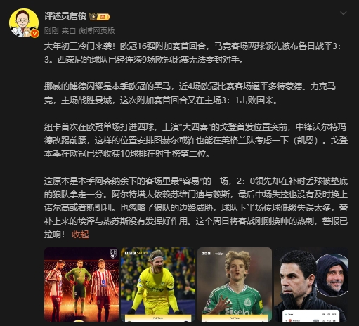 赛后,评述员詹俊发文做出点评。